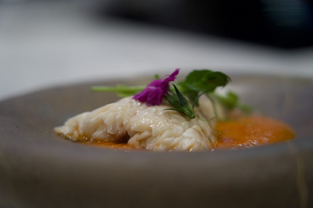 Por otro lado, optamos por un segundo plato que saca partido de las dos grandes despensas de la provincia de Almería: el mar y los invernaderos. Optamos por cocinar un pescado que en nuestra zona se conoce como mújol o lisa. Lo acompañamos con una crema de Lobello, que es un tomate cherry exquisito que cultiva en la provincia Caparrós Nature y que siempre está presente en nuestra cocina.