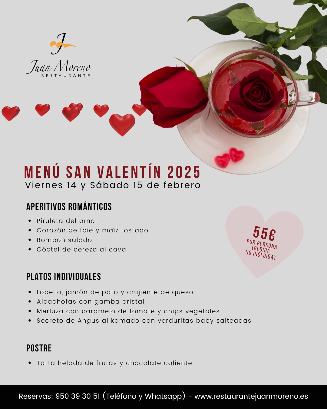 ¿Vas a celebrar el Día de San Valentín en Vera o en el Levante de Almería? Te proponemos que regales a tu pareja una experiencia compartida. Y nada se comparte mejor que una comida o cena memorable. Con la intención de que vuelvas a enamorar a tu media naranja hemos preparado un menú de San Valentín 2025 al que no le falta de nada. Incluye varios aperitivos, platos individuales y postre. Estos son los platos previstos:
