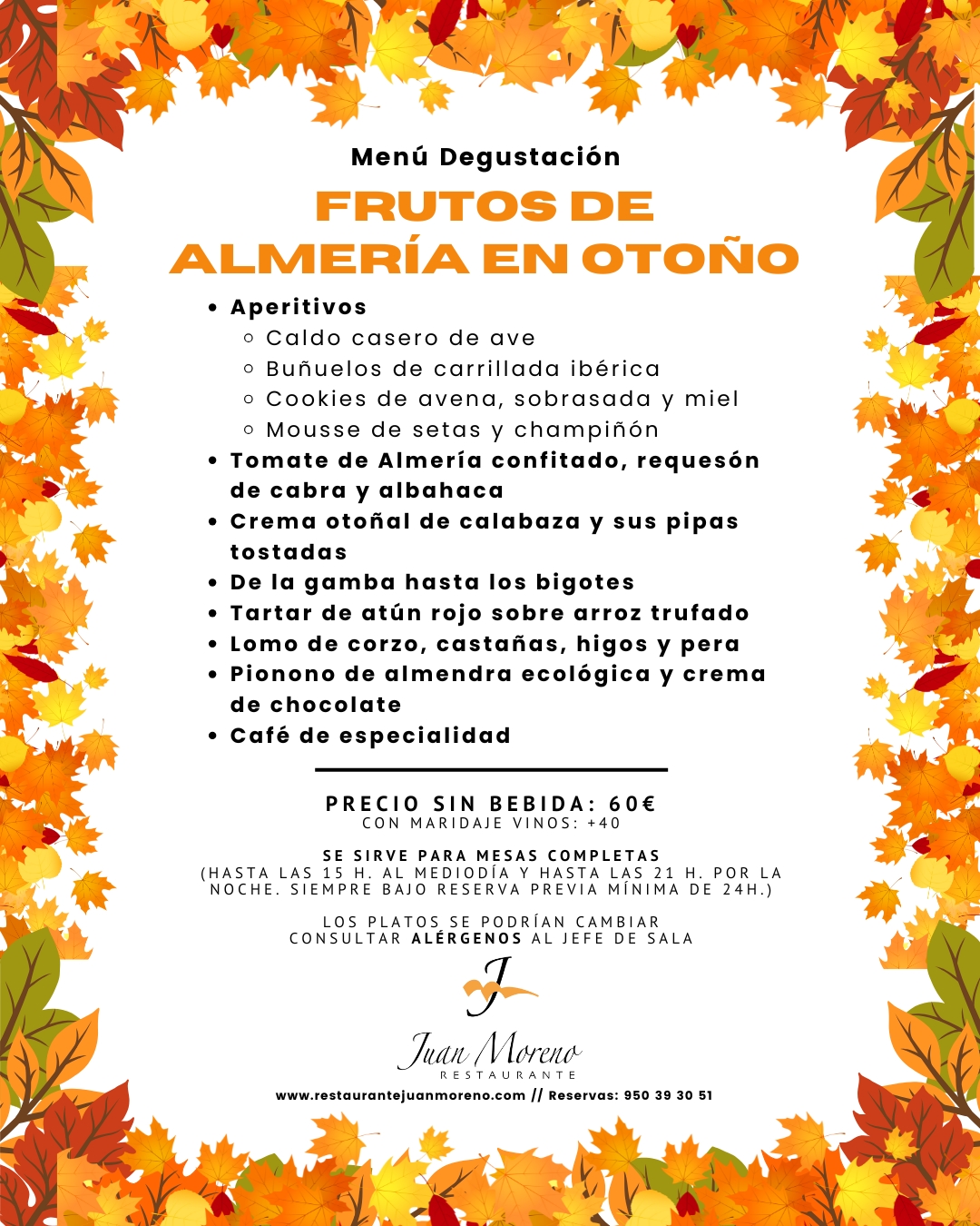El otoño ya huele a setas, calabaza y castañas… y en Restaurante Juan Moreno lo celebramos con un nuevo Menú Degustación: “Frutos de Almería en Otoño”. Una propuesta disponible hasta finales de año, con platos inéditos casi al 100% y un recorrido por los sabores que más nos inspiran en esta estación.
